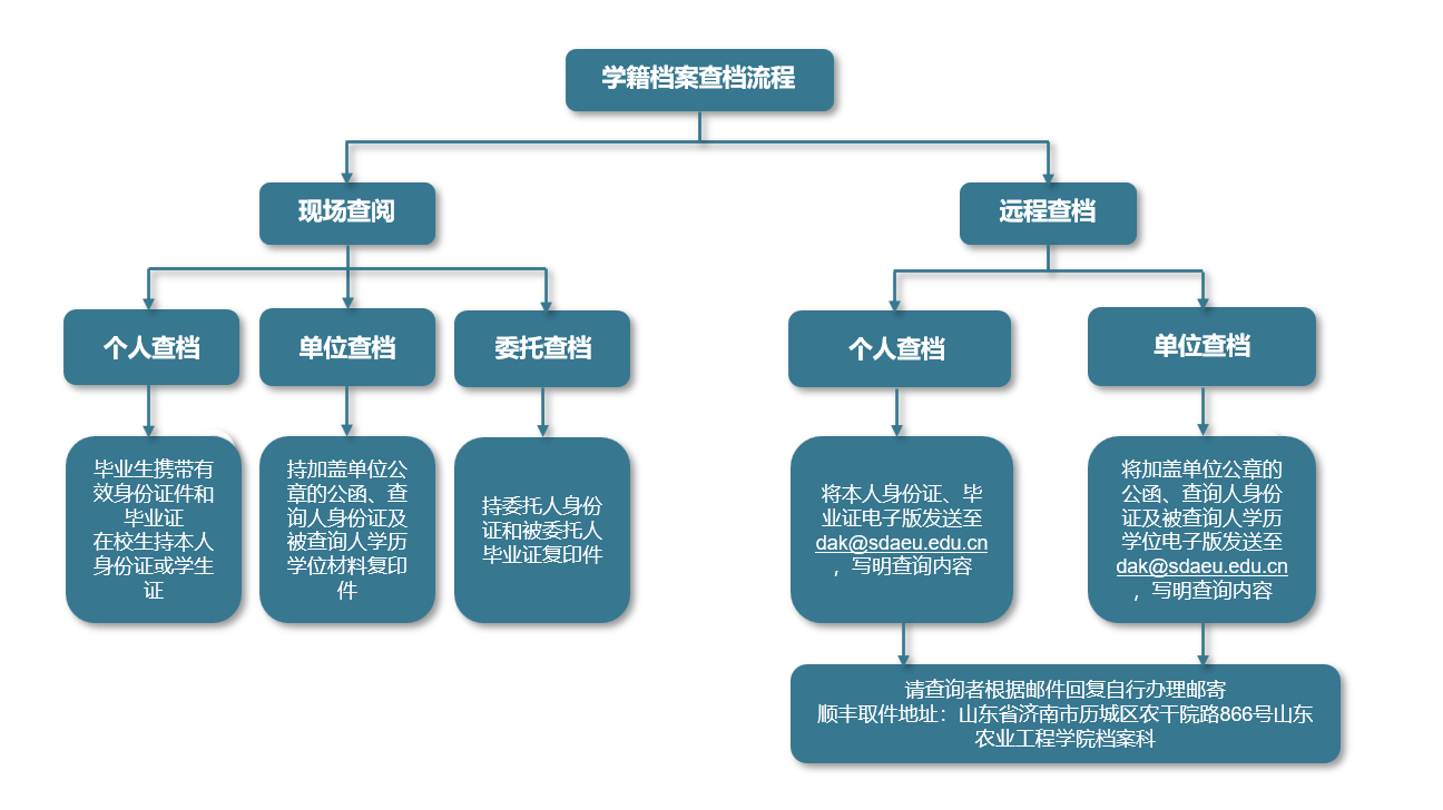 1.个人查档:将本人身份证、毕业证电子版发送至电子邮箱dak@sdaeu.edu.cn,在邮件中写明查询内容(录取新生名册、学籍表、成绩单),并注明联系电话。