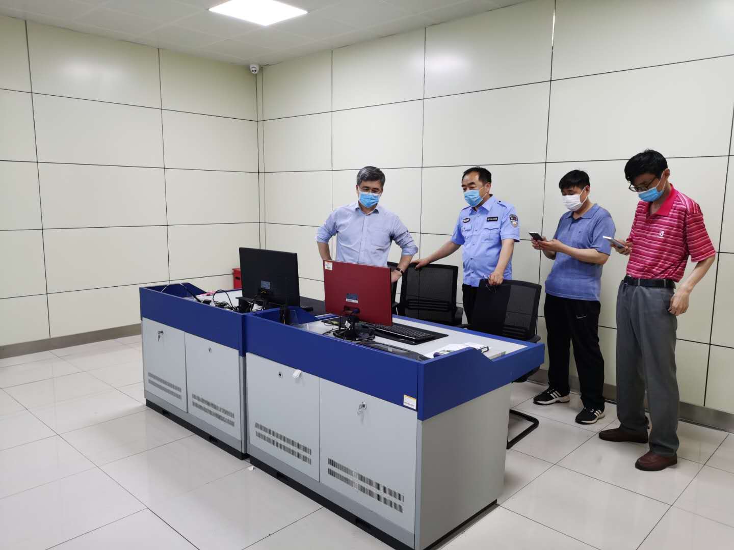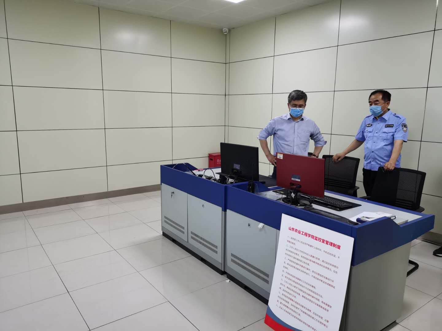 随后张校长与北校区办公室负责人视察了北校区监控室和消防中控,期间张校长详细询问了北校区监控设施分布及运行情况,并对多个重点部位的监控逐个调取查看。监控系统整体运行良好、画质清晰、重点部位全覆盖。对消防中控室中控设备逐一进行检视,详细了解处置流程,并对工作人员进行了业务指导。张校长还对学生宿舍、实验室实训车间、食堂等重点部位进行了现场查看并作出指示。