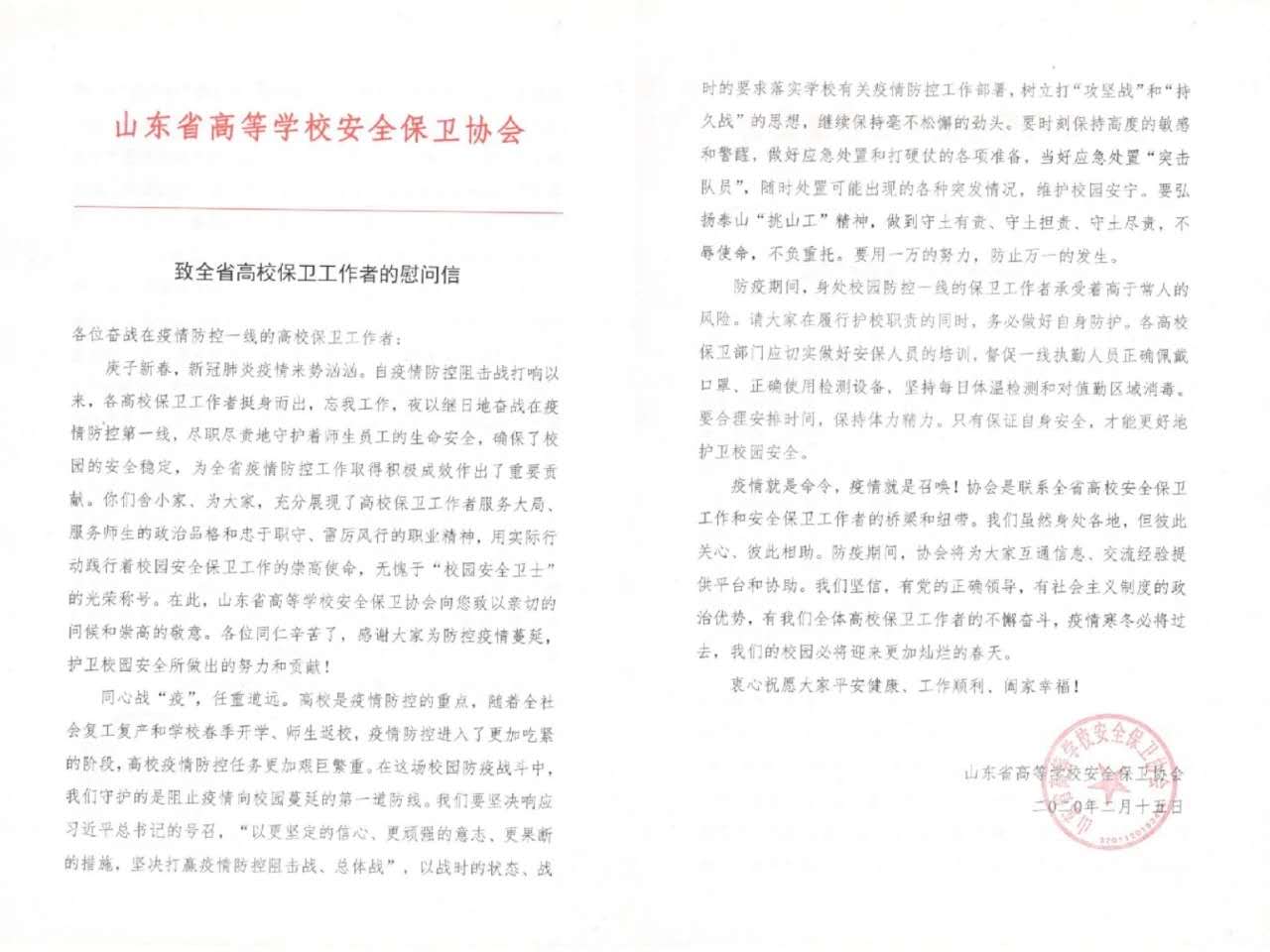 自疫情发生以来,省高校安保协会积极应对、谋划在前,充分利用工作平台及时传达上级要求,时刻保持信息畅通,通过经验交流为高校明确防控方向,确保学校防控一线的精准施策。同时,协会作为安保工作的“贴心人”,还通过多种渠道表达对一线安保人员的关心与支持,把战疫的信心传递给抗疫战士。一直以来,山东省高等学校安全保卫协会作为全省高校安全保卫工作和安全保卫工作者桥梁和纽带,通过组织业务培训提升队伍素质,加强经验交流提升工作水平,推进技防建设提升安防水平,有力的促进高校间安全保卫工作交流合作,为保障高等教育事业又好又快发展起到了积极的推动作用。