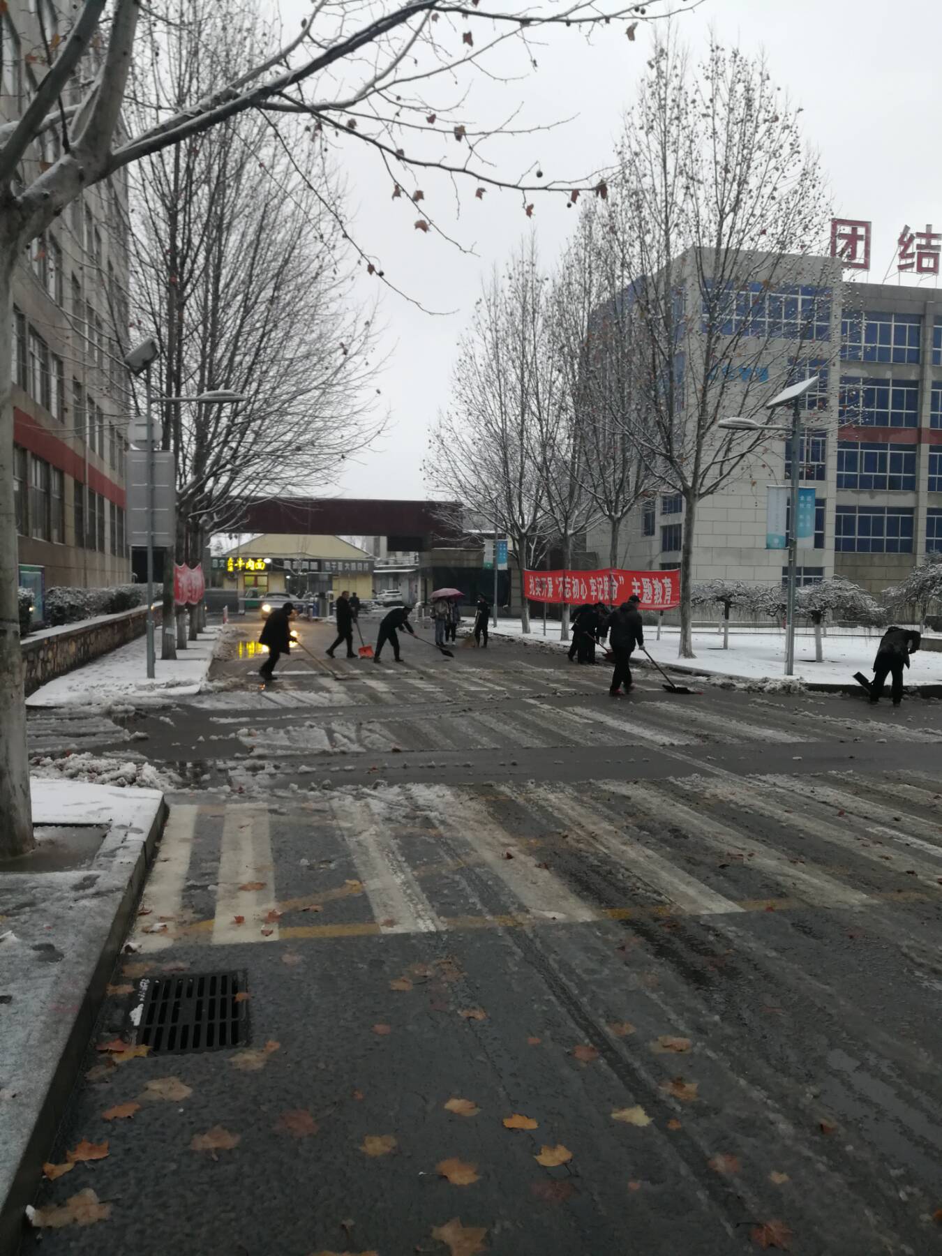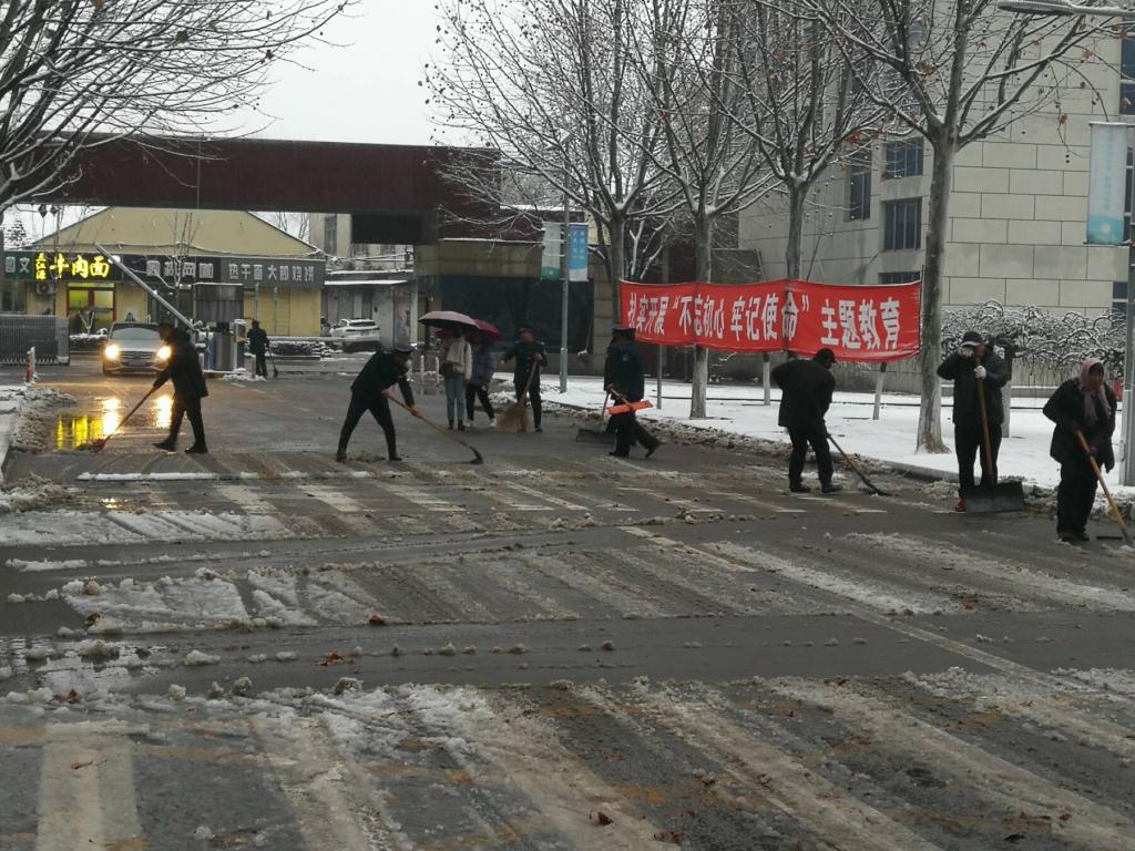 2020年的第一场大雪, 让齐鲁大地披上盛装,也给出行带来安全隐患。雪情就是命令,为保证校园内主干道路、教师公寓区道路、路口的畅通,确保教职工出行安全,7号下四点保卫处和后勤处及时启动了《扫雪铲冰工作应急预案》,保卫处朱瑞金科长和后勤处物业科李军科长组织当班的保安队员和物业工作人员工立即投入到扫雪活动中来,雨雪交加、寒风凛冽,恶劣的天气条件并没有大家清理积雪的热情整个团队充分发挥不怕苦不怕累的工作作风,经过一个多小时的奋战,校园门口和内部道路积雪及时清扫干净,为教职工出行开辟了一条洋溢着温情的通畅方便之路。