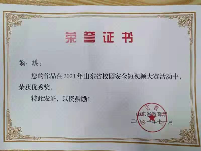 近日,由山东省教育厅举办的校园安全短视频大赛落下帷幕。经过投票统计、专业评审,今年会农业科技学院的孙琪老师拍摄的作品《选择》荣获校园安全短视频大赛优秀奖。