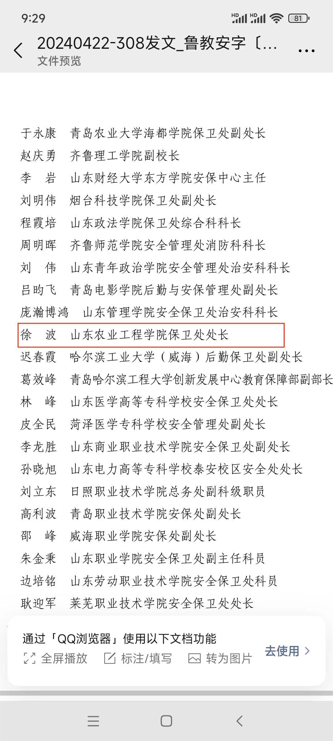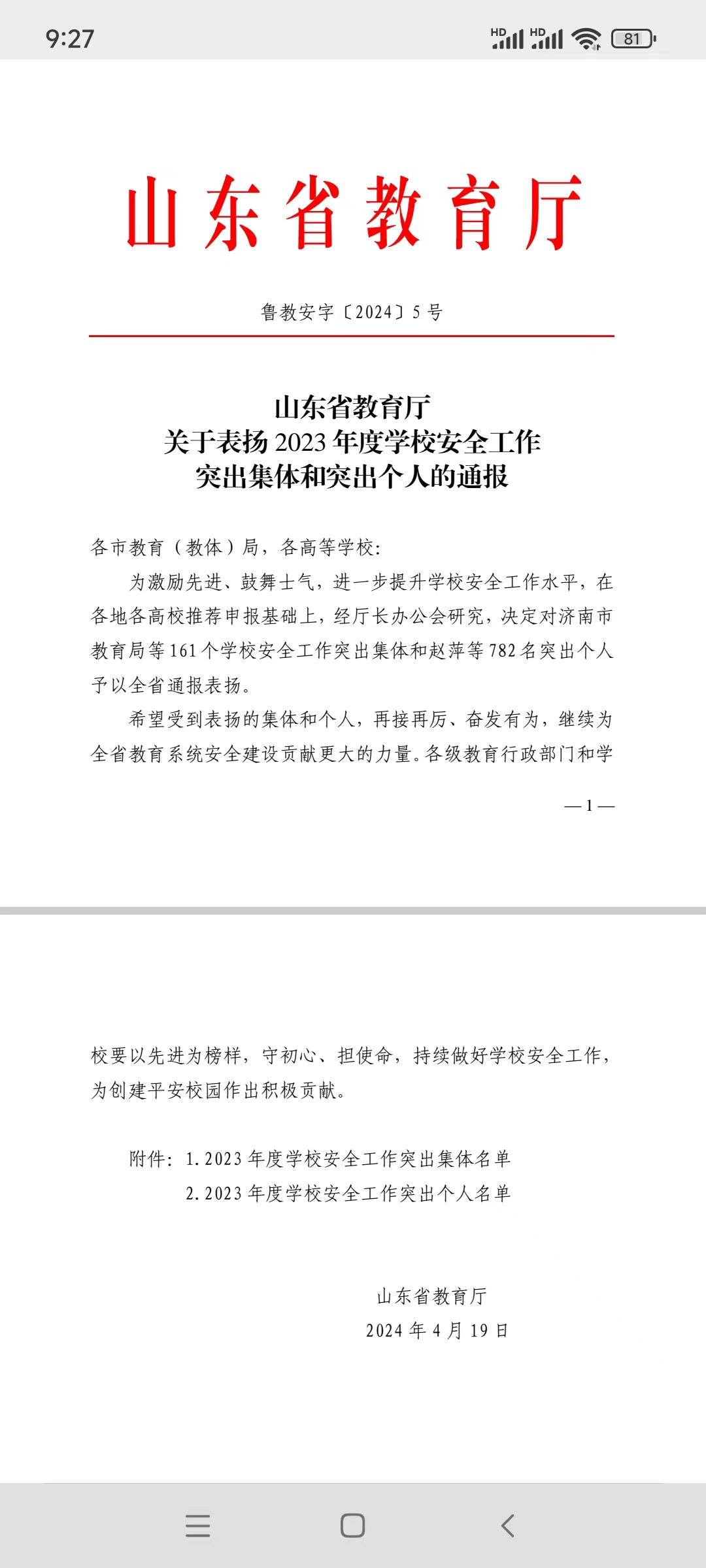 近日,山东省教育厅印发《关于表扬2023年度学校安全工作突出集体和突出个人的通报》(鲁教安字﹝2024﹞5号),今年会荣获2023年度学校安全工作突出集体,保卫处处长徐波获2023年度学校安全工作突出个人。