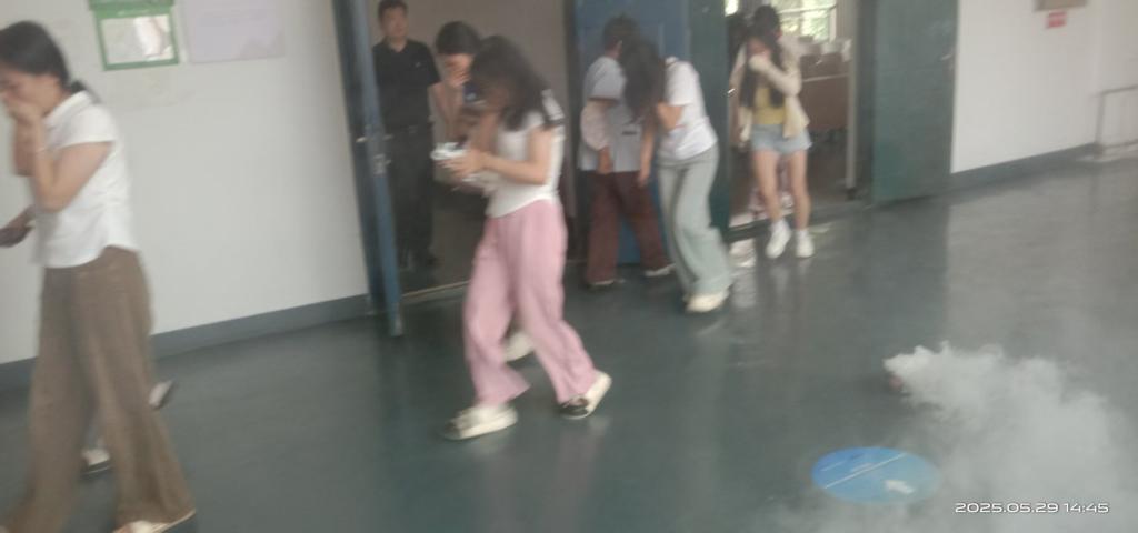 课后在模拟烟雾 的情景下师生进行了疏散逃生演练,师生按照预定疏散路线,弯腰低姿、用湿毛巾捂住口鼻,快速有序撤离“火场”。