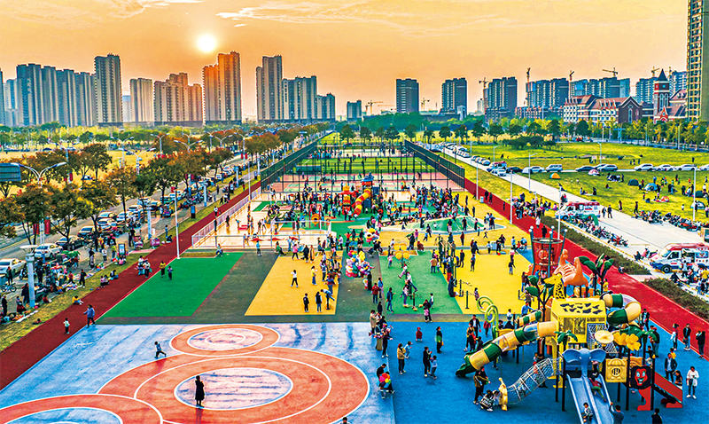 推进中国式现代化,必须坚持把实现人民对美好生活的向往作为现代化建设的出发点和落脚点,不断增进民生福祉,提高人民生活品质。图为2022年10月15日,在江苏省宿迁市苏宿工业园区体育公园多功能运动场,市民正在健身、游玩。 人民图片 陈红/摄
