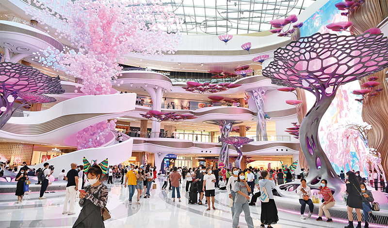 中国坚持对外开放的基本国策,不断以中国新发展为世界提供新机遇。图为2022年10月28日,全球最大单体免税店——海口国际免税城正式开业,市民游客在免税城购物游乐。 人民图片 张俊其/摄