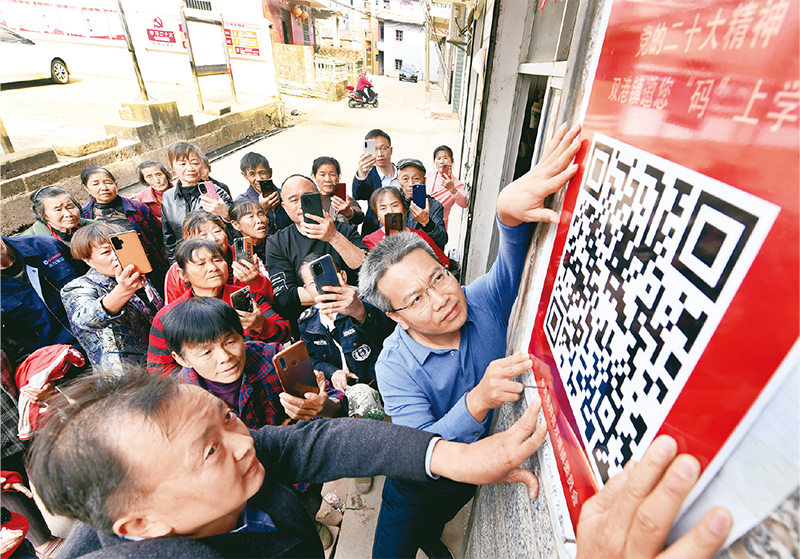 图为2022年11月13日,江西省鄱阳县双港镇党员干部将宣讲党的二十大精神的二维码贴在村头,吸引不少村民前来扫码学习了解有关知识。 中新社发 卓忠伟/摄
