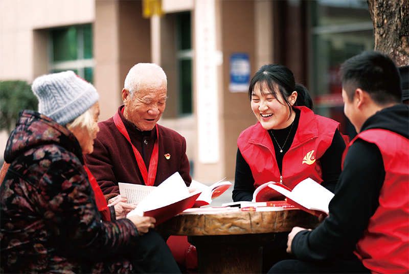 图为2022年11月18日,山东省临沂市郯城县郯城街道“90后”青年党员志愿者与龙泉社区“40后”老党员一起学习党的二十大精神。 人民图片 张春雷/摄