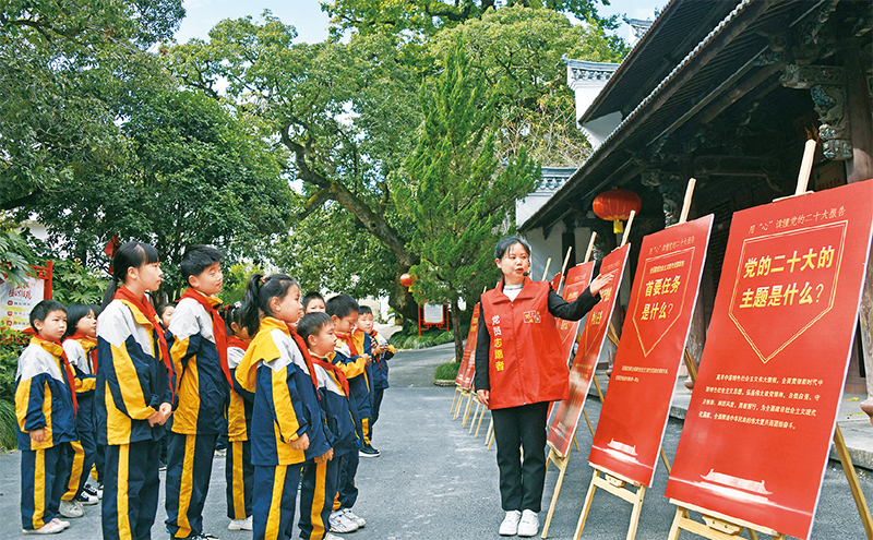 图为2022年10月25日,浙江省台州市上张乡中心小学的学生在中共仙居县委旧址纪念馆学习党的二十大精神。 人民视觉 王华斌/摄