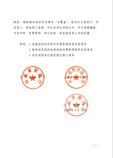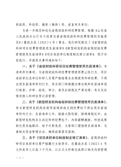 山东省财政厅 山东省科学技术厅 山东省教育厅 关于印发《省级财政科研项目经费管理使用负面清单》《新型研发机构省级财政经费管理使用负面清单》《项目承担单位制度制定修订清单》的通知