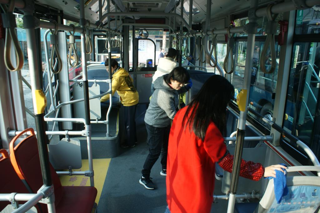 全体党员牢记为人民服务的宗旨,以饱满的热情投入到这次志愿服务活动当中。在进行合理分工后,大家纷纷拿起拖把、水桶、抹布,清理公交车的各处灰尘和污物。这是深秋的下午,大家却干的热火朝天,在公交停车场留下了辛劳的汗水,也留下了一辆辆焕然一新的公交车。看着自己清洁过的公交车驶出公交停车场的那一刹那,党员同志们的成就感油然而生。