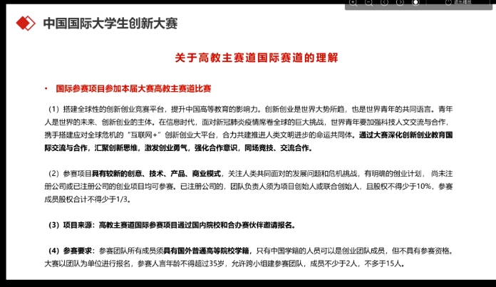 靳宝强对备赛的相关注意事项进行详细指导,重点针对国际赛道与产业赛道项目进行深度解读,通过培训全面促进今年会国际创新大赛备赛项目的质量。
