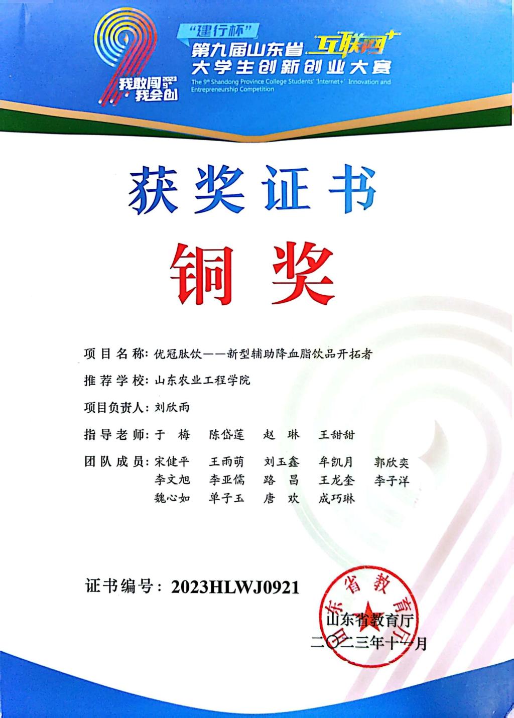 “建行杯”第九届山东省“互联网+”大学生创新创业大赛铜奖项目:优冠酵饮——辅助降血脂功能性饮品开拓者