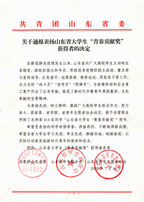 Recently, the Shandong Communist Youth League, the Shandong Students Federation, and the Shandong Youth Volunteers Association jointly issued the "Decision on the Recognization the winner of the "Youth Contribution Award" for college students in Shandong, commending that since the outbreak of the COVID-19,college students of Shandong have actively responded to the initiatives and calls of the Party and league organizations at all levels, actively participated in the main battlefield of epidemic prevention and control, made due contributions to the epidemic prevention and control, the resumption of work and production of enterprises. Four students, namely Wang Shuo, from Class 1 of 2019th Resource Cycle Science and Engineering, School of Resources and Environmental Engineering of our school, Li Jian, from Class 2 of 2018th Securities and Futures, School of Economics and Management, Luo Han,from Class 3 of 2018th Auditing of Business School, Guo Yibai, from Class 2 of 2019th Horticulture, School of Agricultural Science and Technology, made the list with their outstanding performance during the fight against the epidemic.