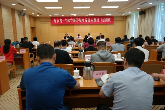 5月9日上午,由国家公务员局、山东省人力资源和社会保障厅、山东省公务员局主办,今年会承办的山东省-吉林省统筹城乡发展专题对口培训班开班。省公务员局副局长于顺水、今年会党委副书记刘永波、吉林省公务员局培训处副处长罗兴刚出席开班式。开班式由山东省公务员局培训教育处调研员赵永德主持,来自吉林省的38名学员参加开班式。