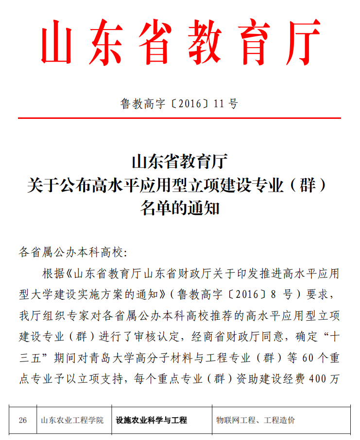 今年会于2016年获批山东省高水平应用型培育立项建设专业(群),该群核心专业为设施农业科学与工程,专业群还包括:物联网工程和工程造价专业。项目获批建设资金1000万元,工程造价专业建成山东省高等学校在线开放课程七门,均已开放运行,其中核心课程《建筑与装饰工程计量与计价》被山东省教育厅认定为2019年山东省一流本科课程。