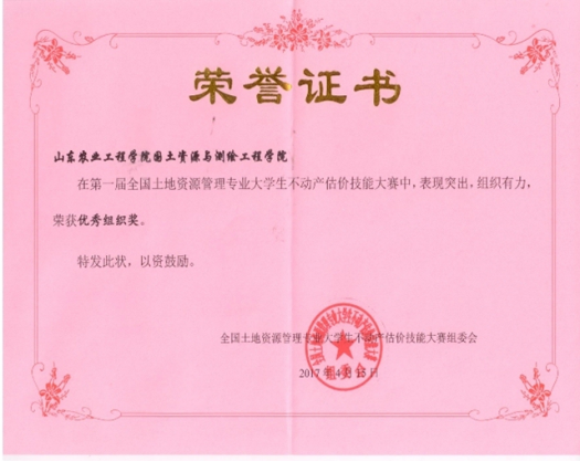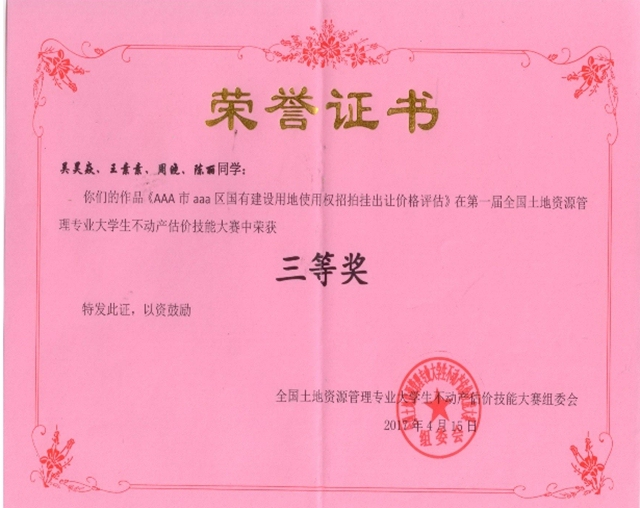 4月15日,由全国高校土地资源管理院长(系主任)联席会主办的首届全国土地资源管理专业大学生不动产估价技能大赛在南京农业大学举行。今年会土地资源管理专业学生吴昊焱、王素素、周晓、陈丽的作品《AAA市aaa区国有建设用地使用权招拍挂出让价格评估》在比赛中获得三等奖,国土资源与测绘工程学院获得优秀组织奖。