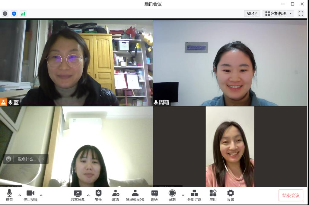 2022年3月28日晚上,工程造价与管理教研室借助上课之余,利用腾讯会议平台与新近教师开展线上教学研讨活动,关心新近教师上课情况和成长。工程造价与管理教研室副主任李伟和本学期有线上授课任务的新进教师贾燕丽、周萌、周楚涵参加本次活动。此次教研活动的开展,推动了新进教师之间的互相交流,展现了新近教师的教学风采,促进新进教师的快速成长。