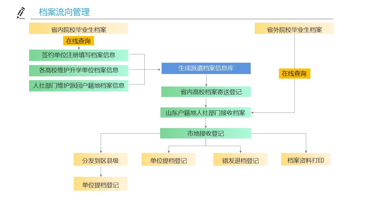 实现山东省内院校毕业生和档案派遣回户籍的省外院校山东生源毕业生的派遣档案信息和档案流向信息查询。