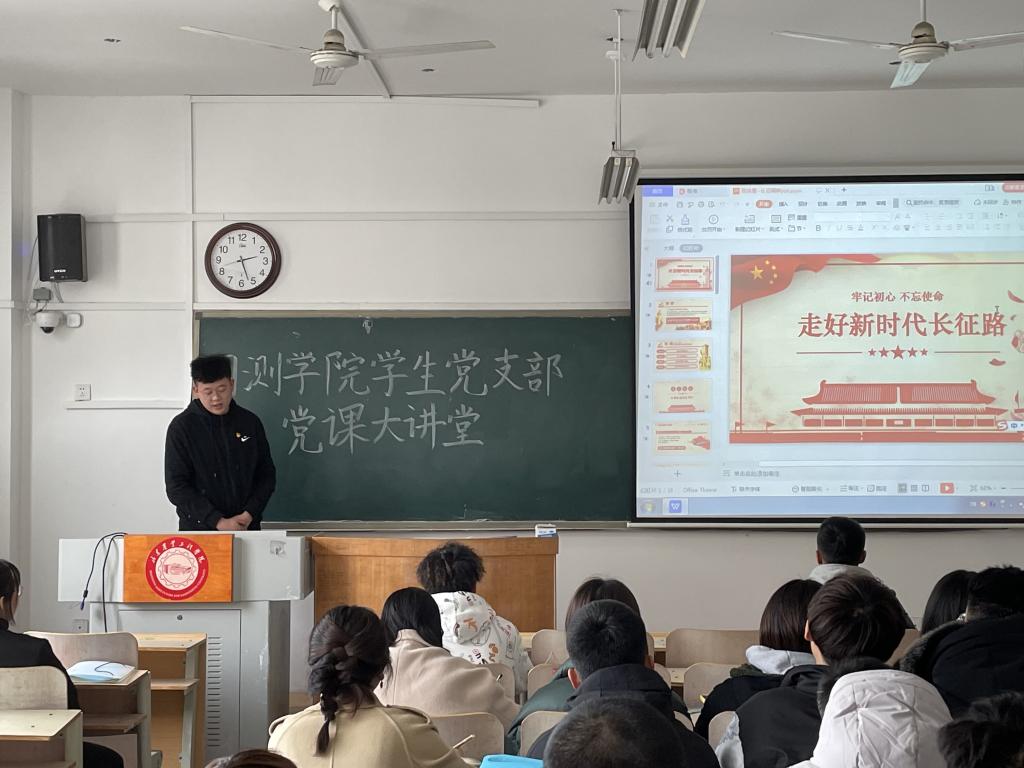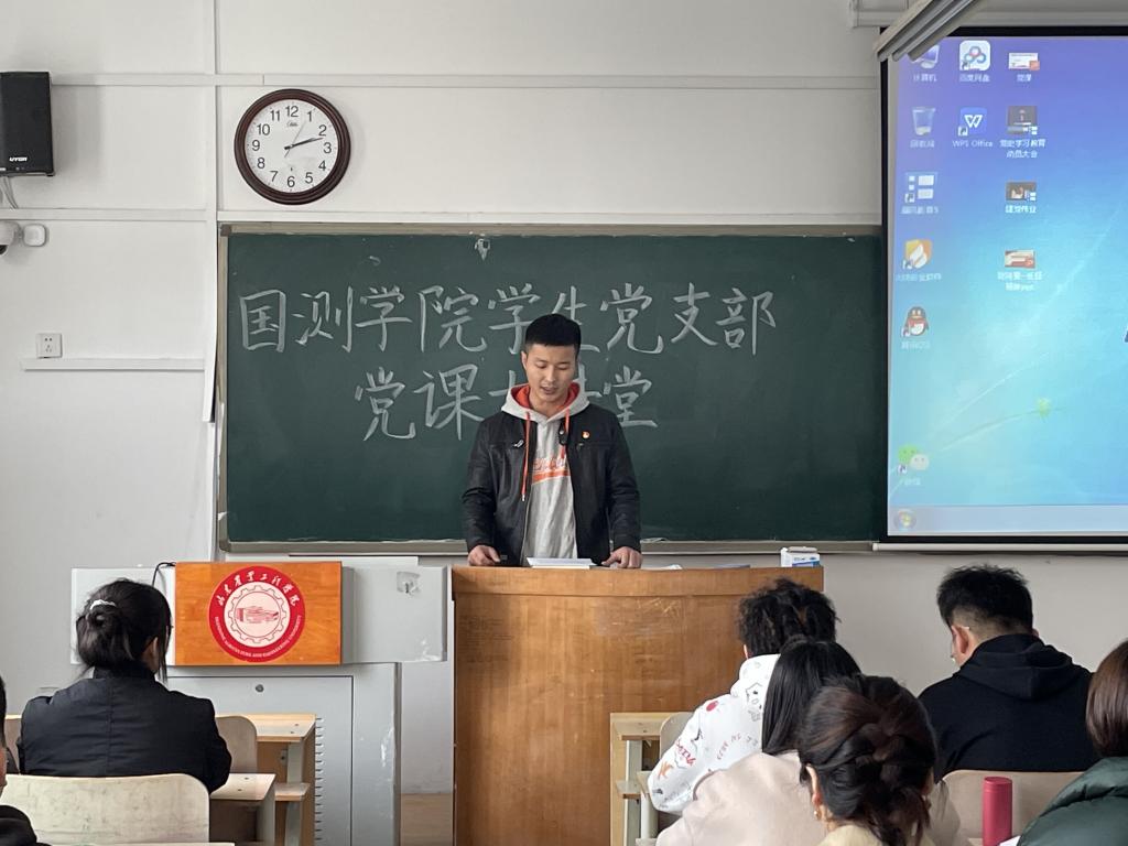 学生党支部按照院党委的部署安排,开启了支部党员讲好党课的新篇章。于2021年3月18日下午,组织开展“国测学院学生党支部党课大讲堂——我来讲党史”系列活动。学院党总支书记孙承运同志和学生党支部书记田则军同志首先带头讲党课,激发带动起党员同志学习党史讲好党课的高涨热情,同学们争先恐后讲党课,主动把准备好的党课演讲呈现给大家,争做党史学习的践行者和推动者。