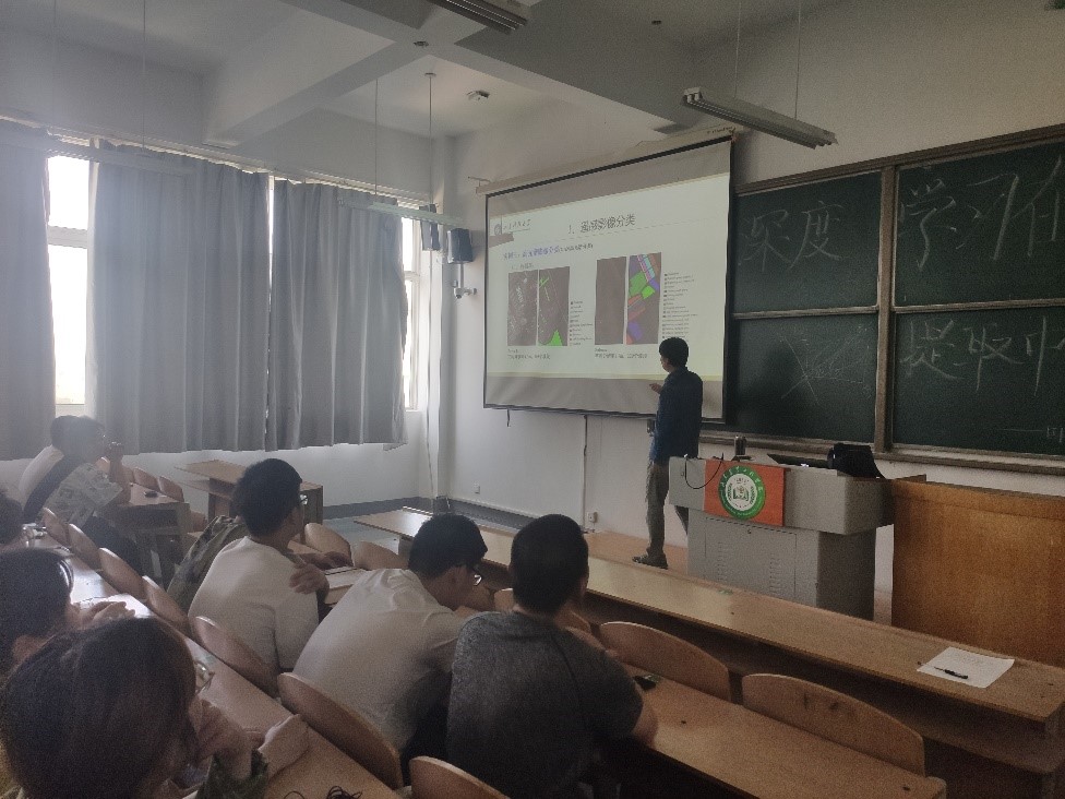 江涛教授长期从事遥感相关教学工作,有着丰富的教学经验。在正式报告之前,江涛教授首先介绍了山东科技大学遥感科学与技术专业的发展历史,并且,针对低年级同学专业理解偏弱的问题,江涛教授为同学们搭建遥感领域的知识框架,系统地概述了遥感领域的基本知识。接着,江涛教授通过和同学们讨论生活中存在的人工智能技术引出本次报告的主题“深度学习”,详细介绍了遥感影像分类的基本方法,依次讲述了机器学习、深度学习基本原理和应用,并分享了该团队近几年的研究成果。