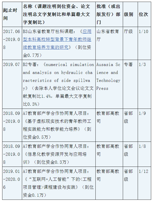 (二)主持教育部协同育人项目共3项,其中新工科课程建设1项;主持校级课1项,2019.01-2020.08,《乡村振兴战略下农村水库移民精准扶贫实施路径研究》项目1项;作为主要人员参与完成中国石油勘探开发研究院横向课题1项:《致密岩心水质组分检测及配伍性对多孔介质伤害测试》(位次:2/17),到位资金8.6万。