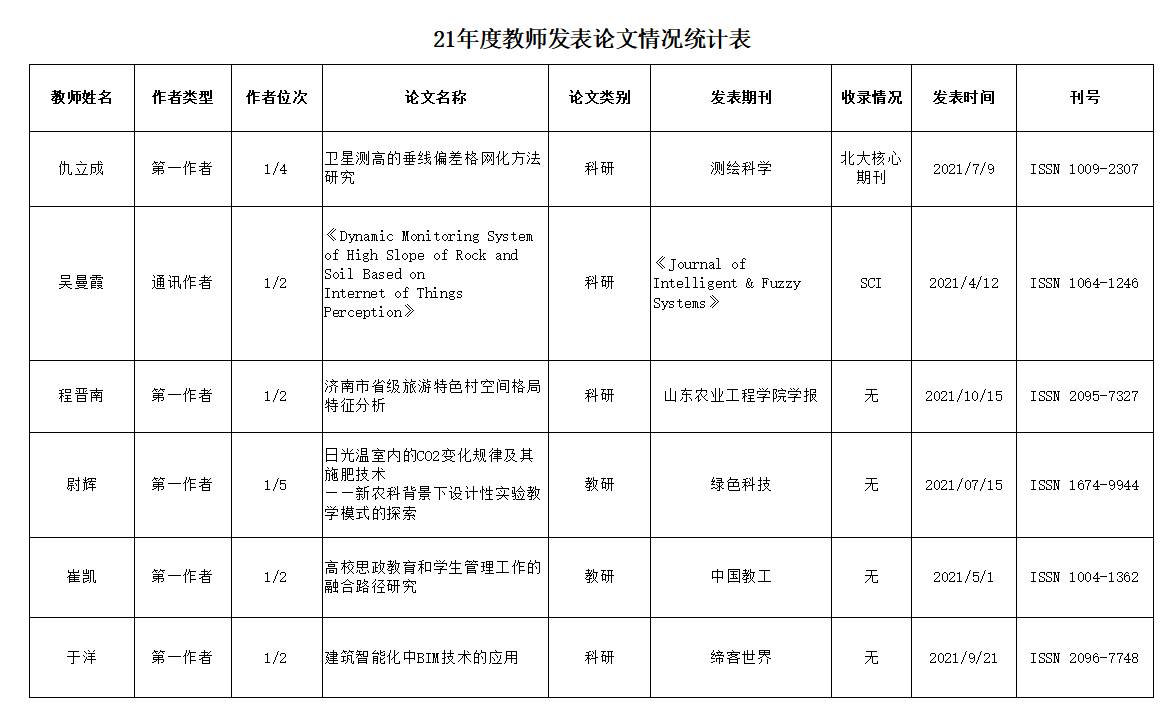 国土资源与测绘工程学院2021年度教师发表论文情况统计表