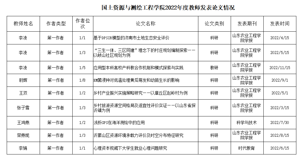 国土资源与测绘工程学院2022年度教师发表论文情况统计