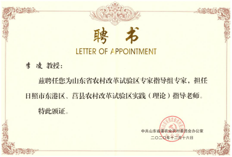 为加强国家和省级农村改革试验区建设,充分发挥专家智库作用,进一步加强化对试验任务的监督和指导,山东省委农村委员会办公室决定成立山东省农村改革试验区专家指导组,国测学院院长李凌教授受聘山东省农村改革试验区专家指导组专家,担任日照市东港区、莒县农村改革试验区实践(理论)指导老师。