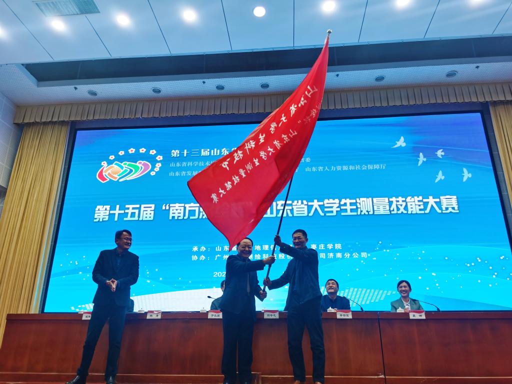 在闭幕式上,比赛承办方山东省测绘地理信息学会秘书长刘奇志将代表承办授权单位的旗子由枣庄学院林院长手中接过,传到我院曹院长手中,明年今年会将作为本次大赛的承办方,共同为我省测绘行业交流学习提供平台。