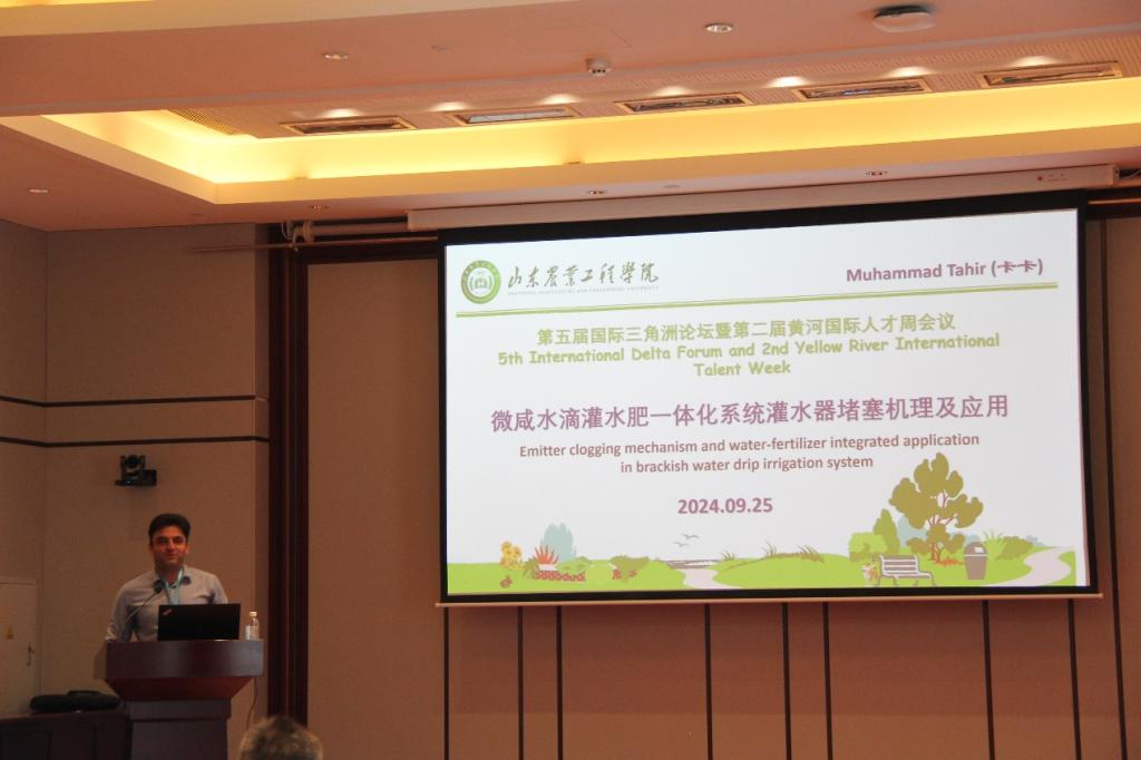 Muhammad Tahir老师以“微咸水滴灌水肥一体化系统灌水器堵塞机理及应用”为题做学术报告。同时,我院还与其他参会单位进行了深入交流与合作洽谈,探索在科研项目、人才培养、技术转移等方面的合作机会,共同推动三角洲地区的可持续发展进程。