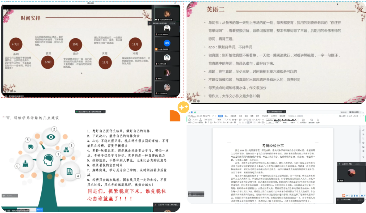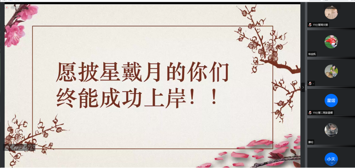 本次线上考研经验交流会持续了近4小时,为2019级土地资源管理专业计划考研的同学提供了宝贵的信息与建议,增进了同学们对备考、面试等方面的了解,明确了下一步行动的重点,坚定了考研的信心。最后,祝愿所有同学的付出甘之如饴,所得一切归于欢喜,待春暖花开之时,疫情已止,我们仍旧追梦前行。