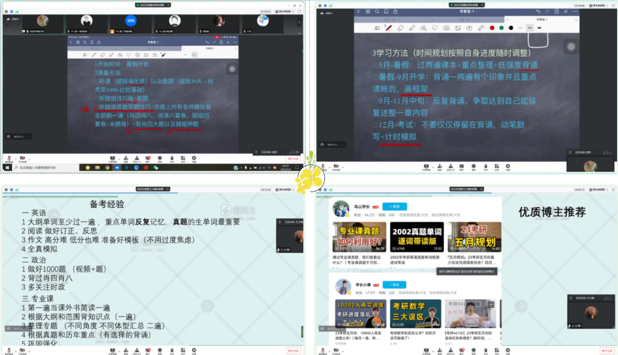 为让同学们了解更多考研资讯,制定科学有效地考研计划。2022年5月4日,我院2019级土地资源管理专业以线上会议的形式开展考研经验交流会。会议邀请到2018级土地资源管理专业刘爽、于子涵、高英晓、郝悦然、李春莹、唐华斌、唐鹏、滕伦、王义博和周佳奇10位成功考取硕士研究生的优秀学生作考研经验分享。