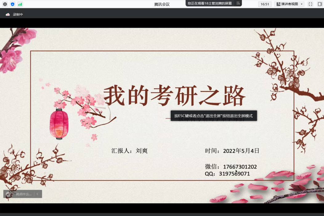 在答疑环节中,2018级的同学就2019级同学提出的问题进行了全面耐心的解答,帮助大家走出考研认知的误区、解除考研疑虑、坚定考研信心。最后,摄晓燕老师对此次会议进行了总结,也将自己考研过程中的一些宝贵经验分享给参会同学,鼓励同学们要不忘初心,持之以恒,争取更好的成绩。