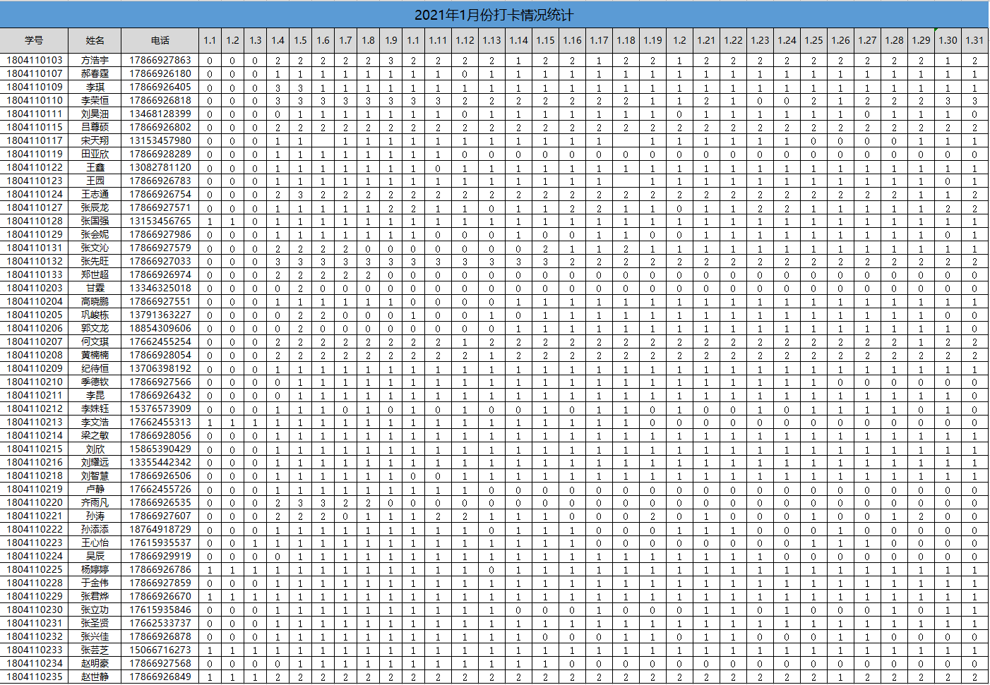 自寒假以来,2018级测绘工程专业的班主任曲亚男老师,一直心系学生,坚持每天学习打卡,在QQ群关注学生寒假生活,全班保持良好的学习氛围,打卡活动已成为学生假期充电的最佳途径。寒假打卡项目包括英语学习、时事新闻、专业拓展、规律作息等多项内容。