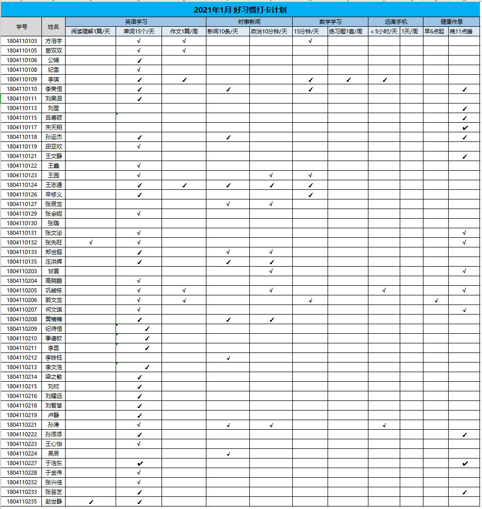 由学生自主制定学习目标与打卡数量,然后每天坚持打卡和上报,通过日积月累的坚持,保持良好的学习状态,为以后考研和就业打下良好的基础。疫情期间,学生的假期生活安排尤为重要,每天打卡可以保持良好的学习习惯,通过自主学习,保证每天有居家学习的时间,减少外出的风险,使学生度过一个安全又充实的寒假。