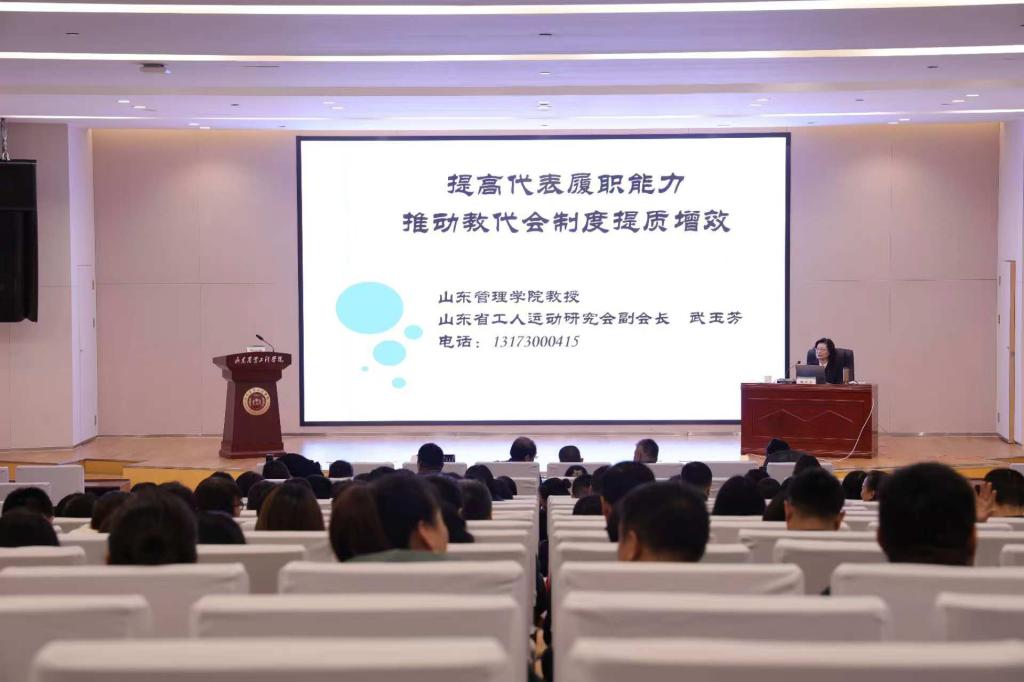 本次培训邀请是山东省工人运动研究会副会长、全国总工会民主管理专家库专家、山东管理学院武玉芳教授,以“提高代表履职能力,不断推动教代会制度提质增效”进行培训。吴教授从工会的职责及三个委员会的产生;高校教代会职权及教代会工作制度;代表的权利义务和职责;如何写好教代会提案四个方面进行了深入浅出、详细细致的讲解。