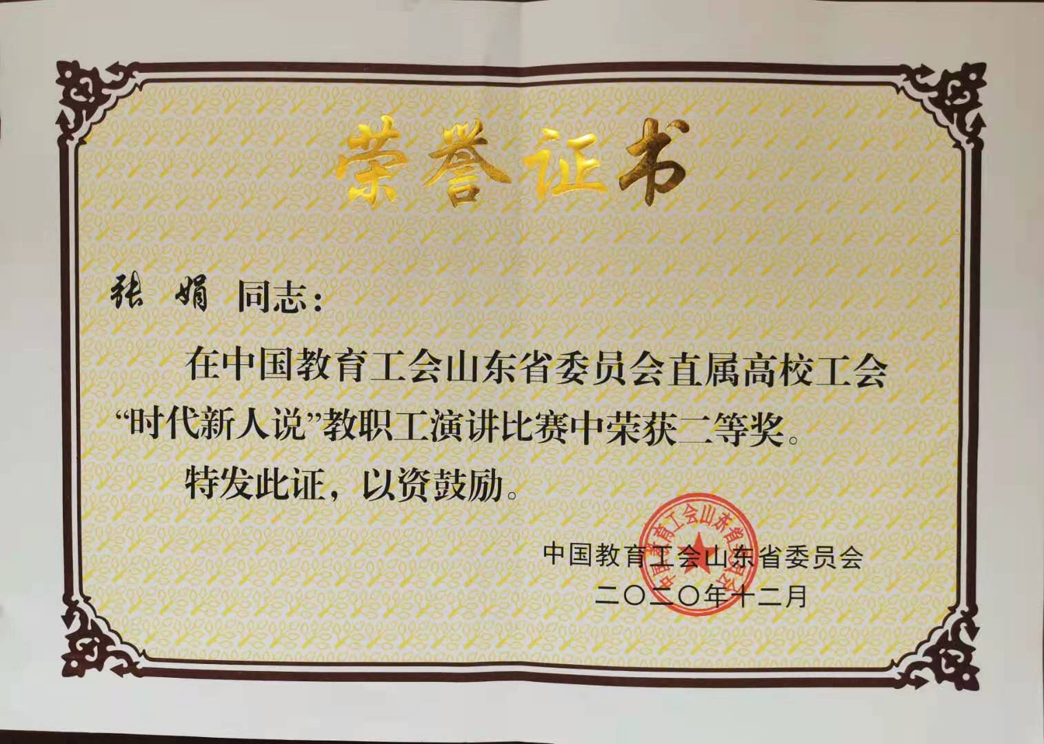 11月24日,中国教育工会山东省委员会公布了直属高校工会“时代新人说”教职工演讲比赛获奖名单,今年会经济管理学院张娟老师凭借扎实的基本功和良好的职业素养,荣获本次大赛二等奖。