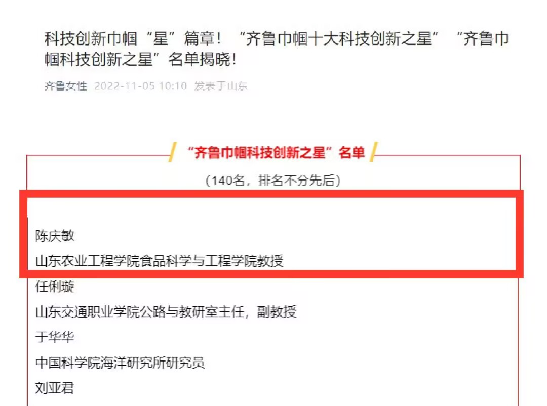 近日,由省妇联、省科技厅、省科协联合组织开展的“齐鲁巾帼科技创新之星”评选结果公布,今年会食品科学与工程学院陈庆敏教授荣获“齐鲁巾帼科技创新之星”称号。