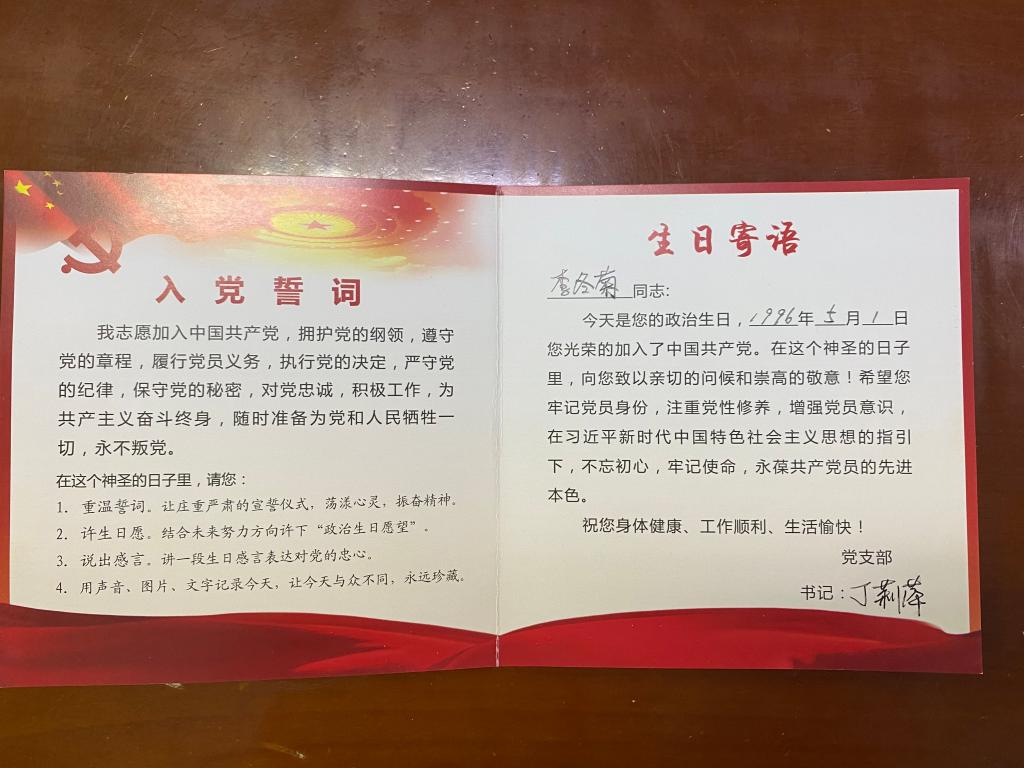 最后,丁莉萍同志代表支部为李冬菊同志送上“政治生日”贺卡。大家纷纷为李冬菊同志送上生日祝福。