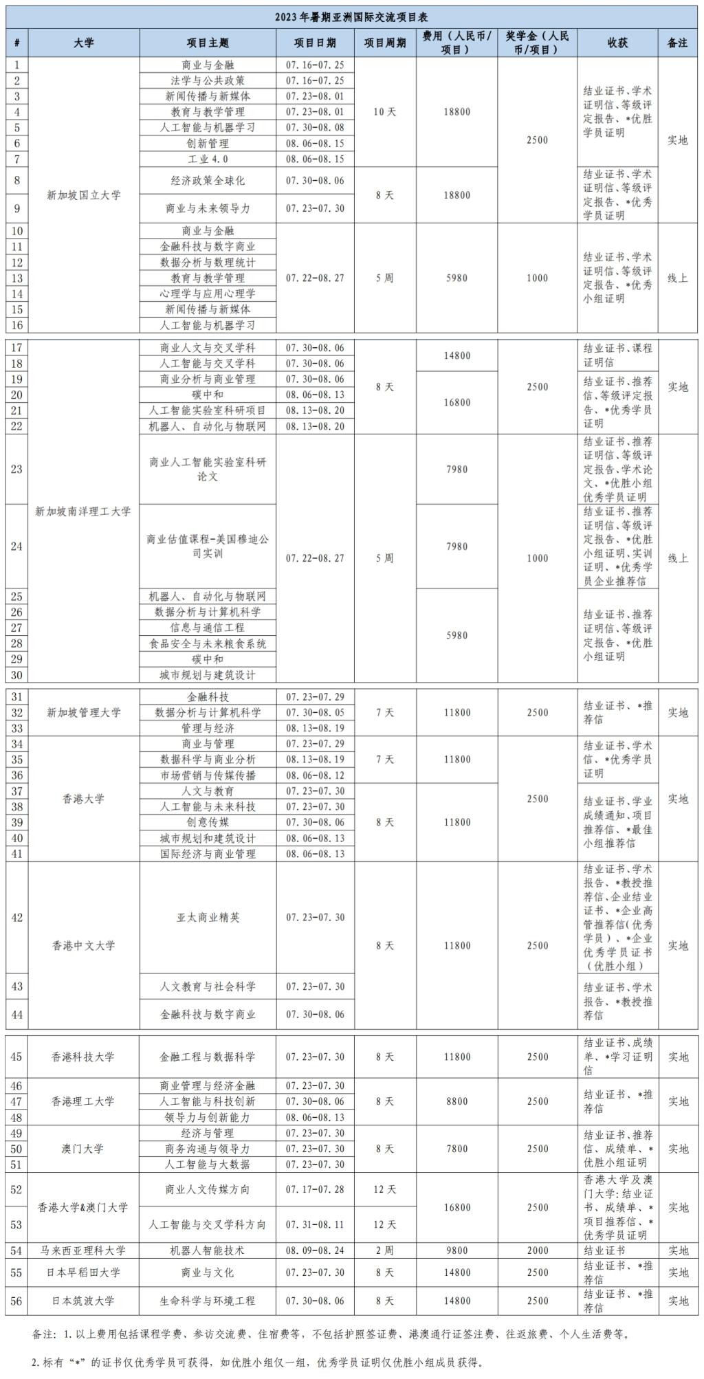 为加强学校国际化人才培养,满足在校生通过海外优质教育资源提升国际视野和学术能力的需求,提高应用型人才培养质量,学校计划于2023暑假开展世界名校国际交流活动,现就亚洲相关高校报名与具体内容相关事项通知如下: