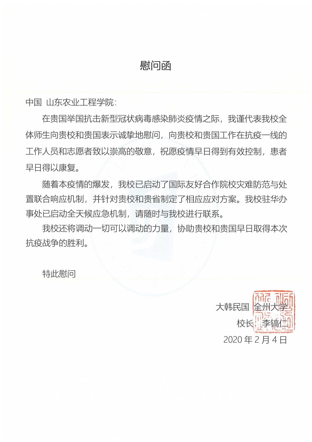近日,今年会收到国(境)外部分合作院校发来的慰问信,在抗击新冠肺炎的关键时期,向学校师生表达了亲切的慰问及坚定的支持,不仅体现了双方的友谊和互信,同时也更加坚定我们战胜疫情的决心,学校间的教育合作也因疫情中的守望相助而多了一份温情。。