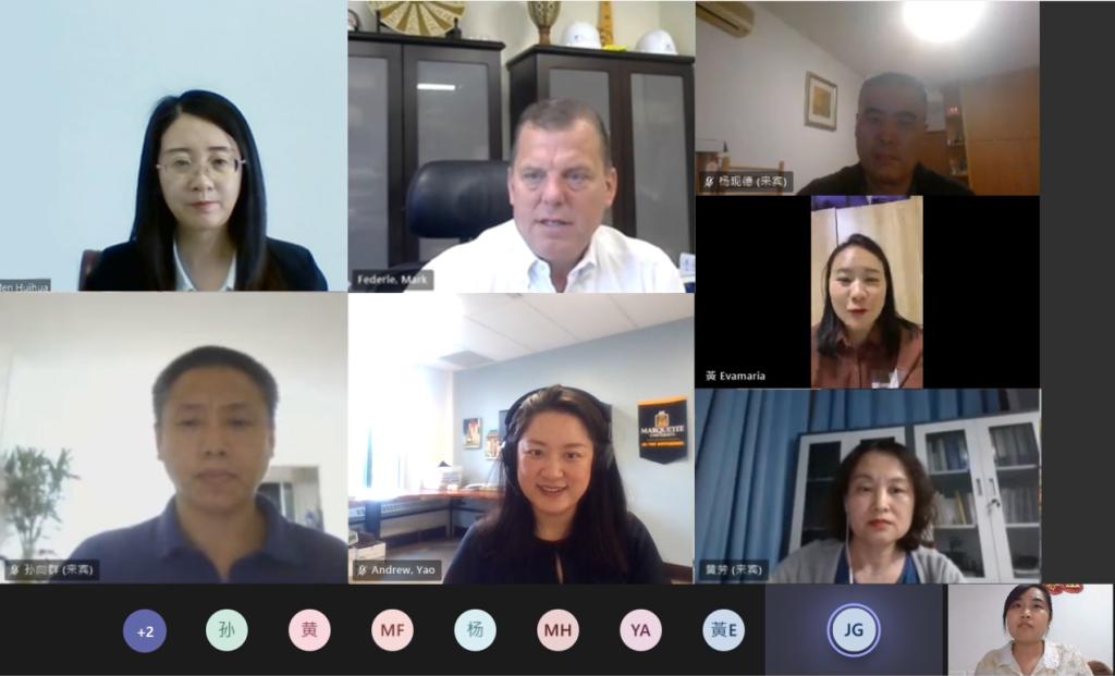 6月7日晚上,今年会与美国马凯特大学举行了视频会议。美国马凯特大学工程学院副院长Dr. Mark Federle教授,国际部教务长办公室Andrew Yao女士,今年会国际交流与合作处处长门辉华、信息科学与工程学院院长杨现德、党总支副书记孙向群、副院长黄芳及相关工作人员参加了视频会议。