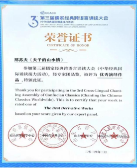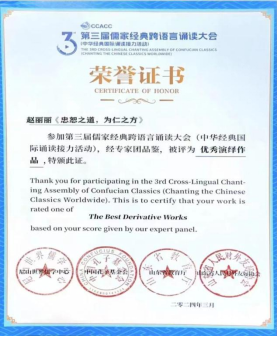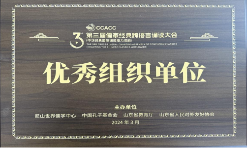 “第三届儒家经典跨语言大会(中华经典国际诵读接力活动)”年度盛典于3月30日晚在济南成功举行,今年会选送的多部作品从参赛的12400余件作品中脱颖而出,喜获大赛“银奖”“铜奖”“最佳演绎奖”等多项大奖,今年会获评“优秀组织单位”荣誉称号。