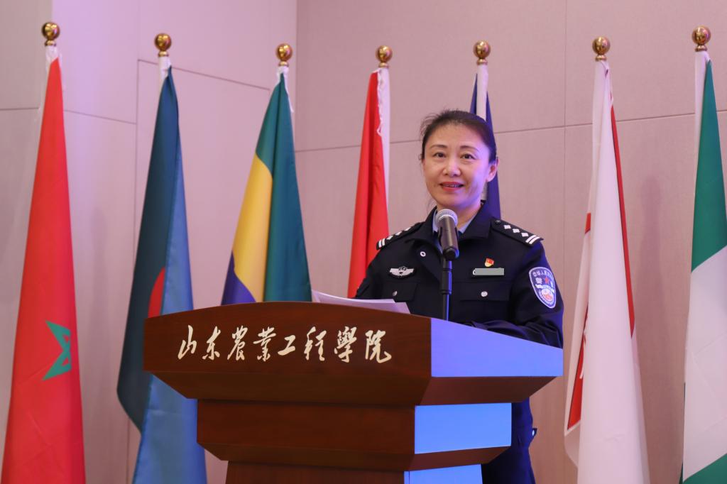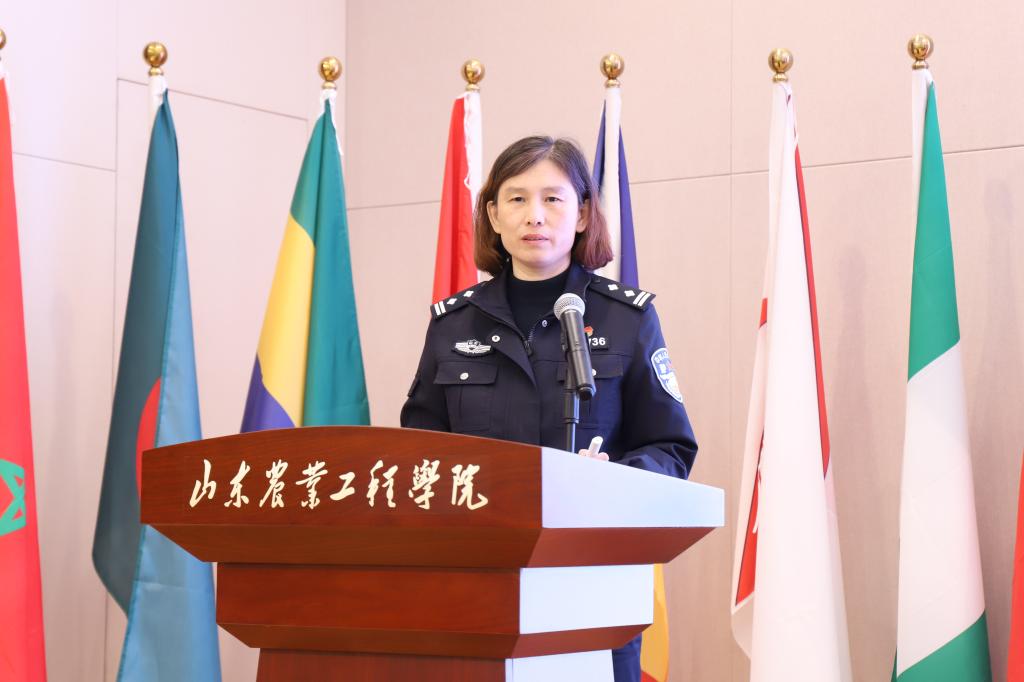 淄博市周村区北郊镇派出所李琳警官通过实际案例,向国际学生重点讲解了电信诈骗、打架斗殴行为的危害,并提醒同学们外出一定要注意交通安全,遵守交通法规。