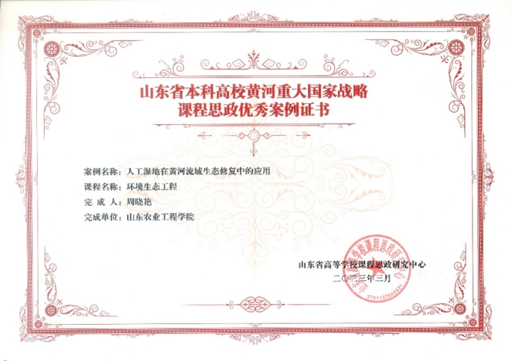 为贯彻落实黄河流域生态保护和高质量发展战略,根据山东省教育厅高等教育处《关于转发山东省高等学校课程思政研究中心<关于开展山东省本科高校黄河重大国家战略课程思政优秀案例评选活动的通知>的函》和山东省高等学校课程思政研究中心《关于开展山东省本科高校黄河重大国家战略课程思政优秀案例评选活动的通知》文件要求,我院周晓艳、李静两位老师按照学校安排部署,充分筹备并参加评选,在此次评选活动中获评优秀案例。