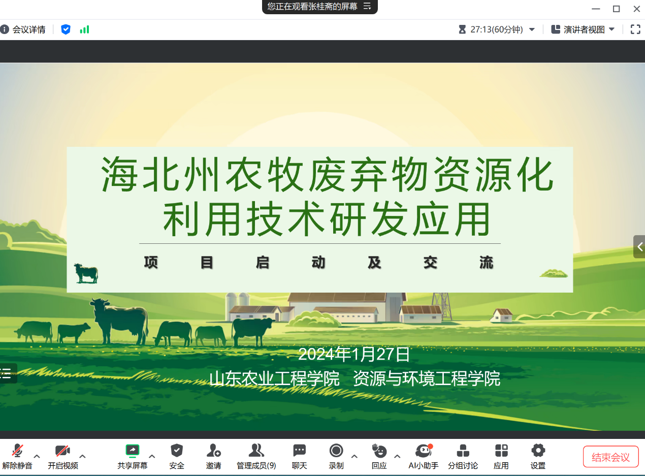 为大力推进“海北州农牧废弃物资源化利用技术研发应用”项目的顺利进行,我院于1月27日联合青海省农林科学院、海北藏族自治州农牧综合服务中心、山东生态家园环保股份有限公司和青海五丰生物科技有限公司等合作单位,采用线上腾讯会议的方式举办了项目交流探讨会。学院院长张桂斋、副院长江丽华、环境生态工程教研室副主任李静、学院教师郭辉和巩春娟共同参加,此次会议由学院副院长江丽华主持。