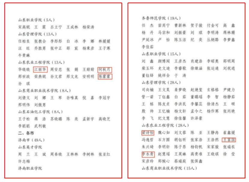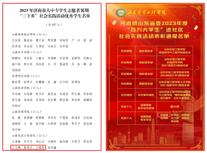 此外,在2023年山东省暑期“三下乡”社会实践活动评选中,“高青畜禽粪污资源化利用团队”荣获优秀服务团队称号;江丽华、陈蒙蒙、何秋月3名教师荣获优秀指导教师称号;梁诗怡、王富国、李永青3名学生荣获优秀学生称号。