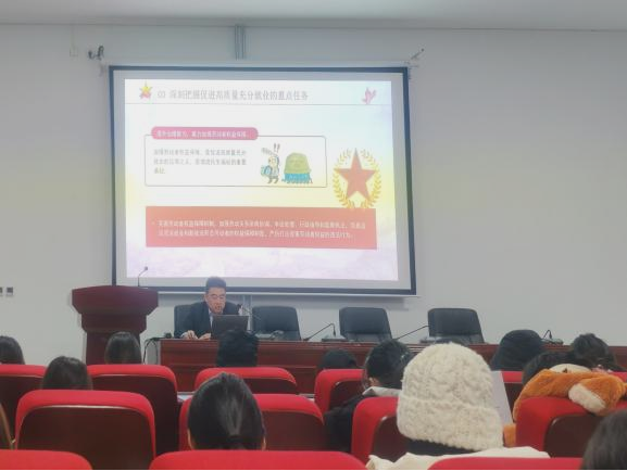 我院党总支书记马朝阳以党的二十大报告为切入点,运用详细案例和生动语言,深入浅出地为同学们阐述了人才强国的战略意义。他从“新时代人才培养目标”和“新时代人才工作”两个维度出发,全面剖析了我国人才发展的主要方向和未来目标。马朝阳鼓励同学们要常怀爱国之心,砥砺报国之志,肩负起时代赋予青年人才的重任。