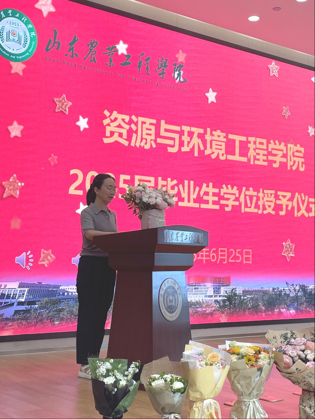 “经校学位评定委员会审议,决定授予陈晓菲等同学学士学位!”院长张桂斋代表学校学位评定委员会宣读了本届本科毕业生学位授予的决议和学院首批获得学士学位人员名单。她既表达了对毕业生学业成果的充分肯定,更饱含着对学子们未来发展的殷切期许:“你们是学院最鲜活的名片,愿这份学术荣光成为你们奔赴山海的底气。”