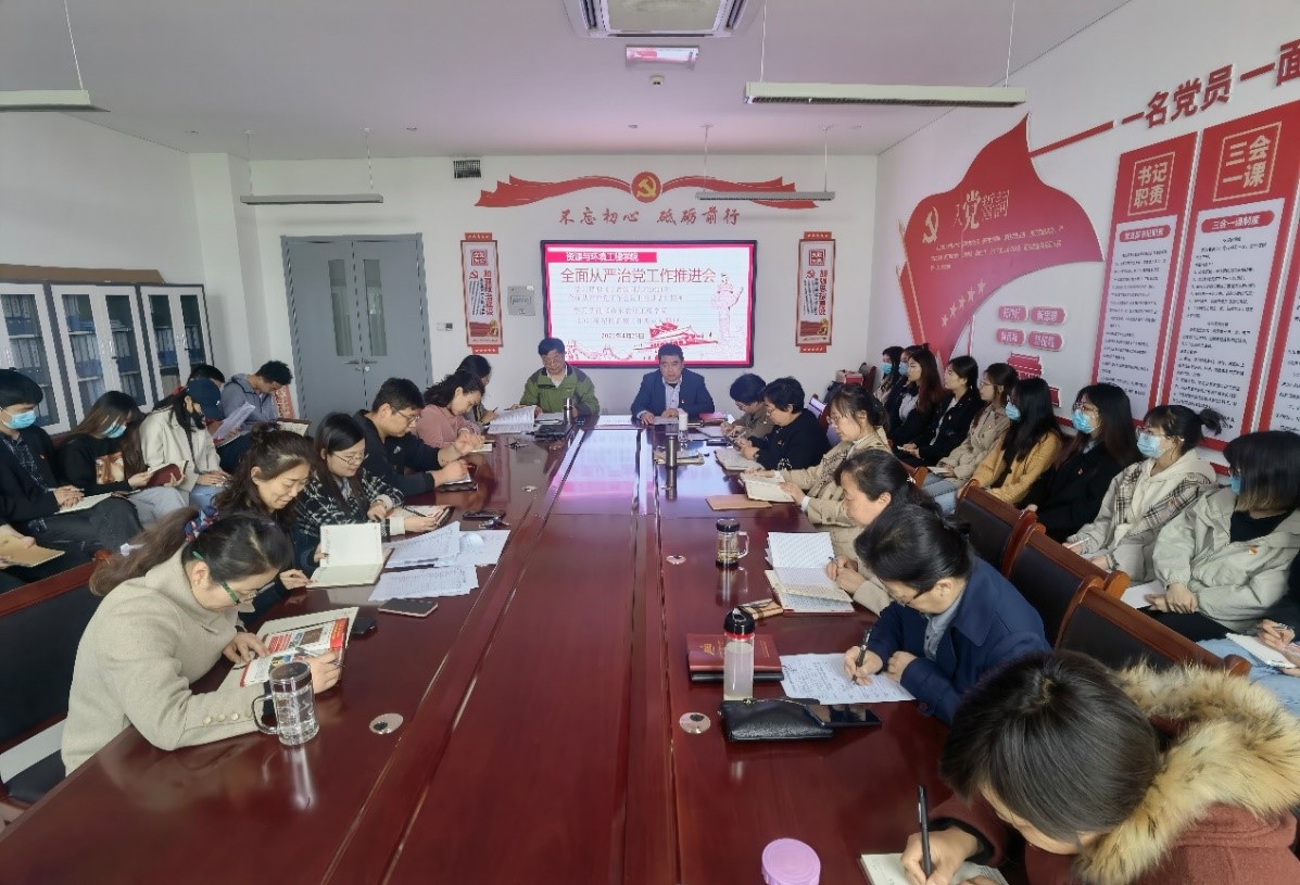 2021年4月25日下午,我院在淄博校区理工西楼党员活动室召开了学院全面从严治党工作推进会,会议由我院党总支副书记马朝阳同志主持,我院全体教职工及大学生党员参加了会议。